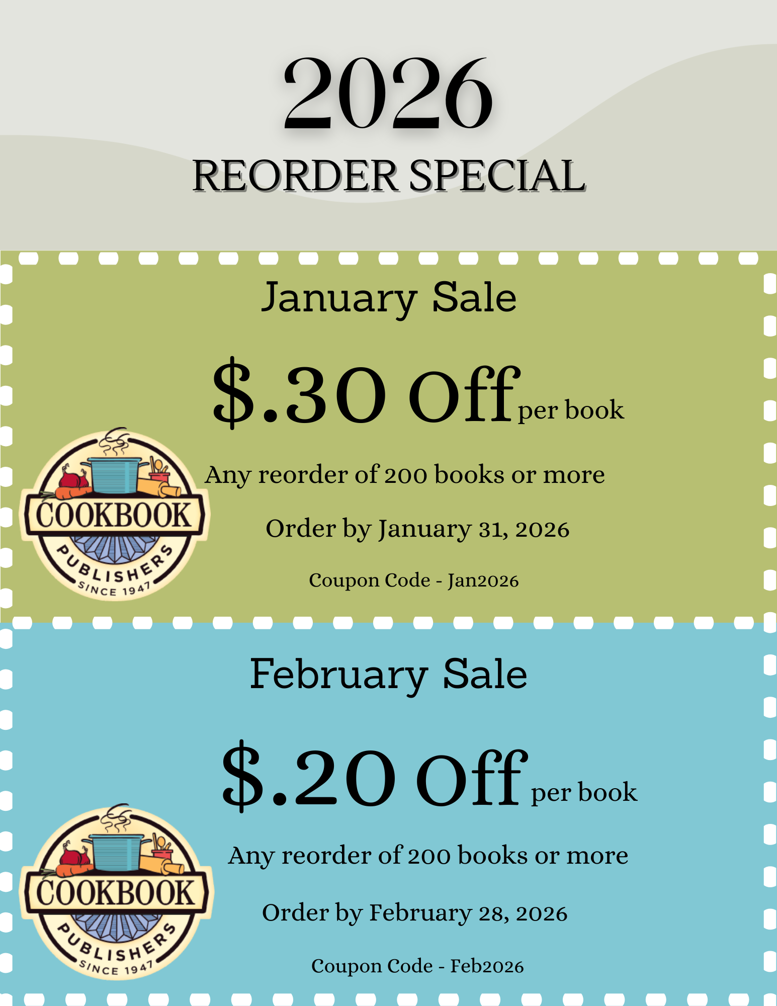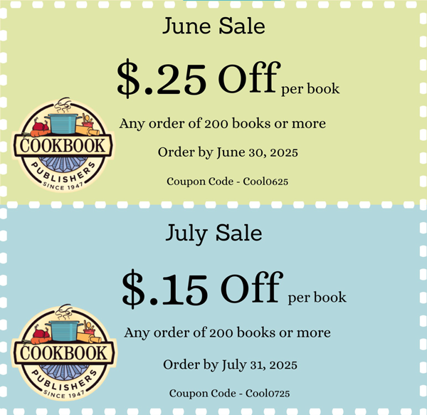 ORDER KIT 1-800-227-7282 EMAIL US Coupons & Offers The recipe for a great cookbook involves a cup of savings! Home » Pricing » Coupons & Offers Make sure you print this coupon and submit it with your cookbook order form. Other Pricing Information Price Estimator Payment Terms COUPON OFFERS Production Deadlines Reorders